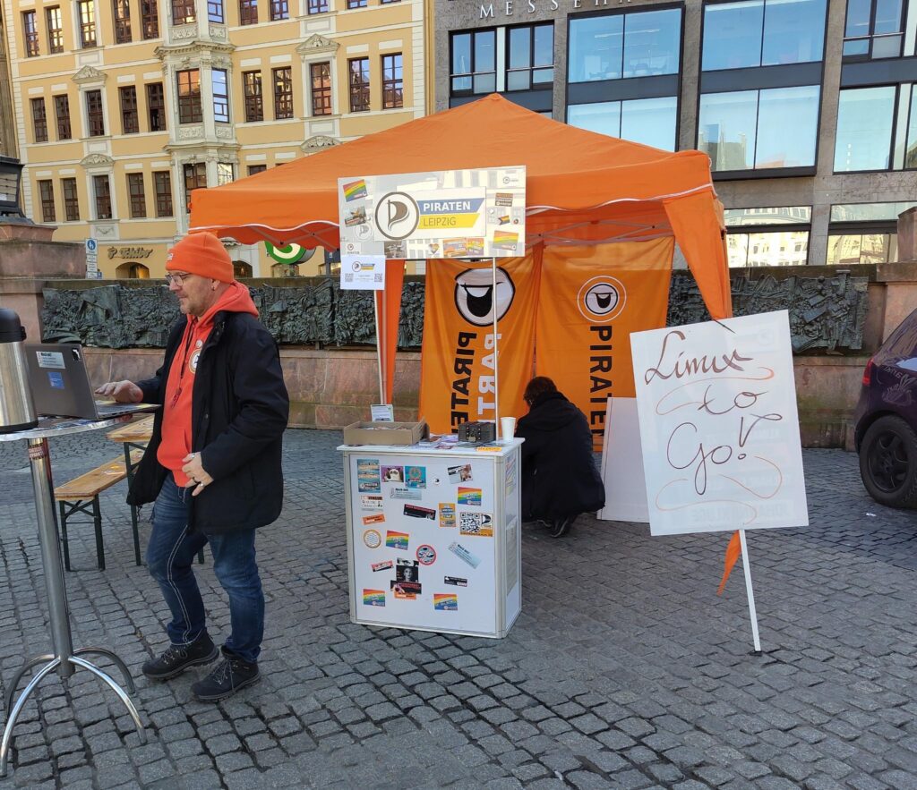 Gestern standen wir mit unserem Piratenstand und der Aktion Linux to go! auf dem Leipziger Marktplatz, zum einen, um mal wieder ein wenig Werbung für uns zu machen (viel zu oft hören wir den Satz „Euch gibt’s noch?“, das wollen wir natürlich ändern) und zum anderen, um euch mit unserem Linuxwissen zur Verfügung zu stehen. Schließlich sind wir ja, neben einigen anderen Dingen, auch eine Digitalpartei. Da liegt ein wenig Linuxsupport nahe. Während des Events hattet ihr nicht nur die Möglichkeit, euch mit Linux helfen zu lassen und tolle Sticker einzusammeln, sondern auch die Chance, mit unserem Piratenstadtrat Paul ins Gespräch zu kommen.
