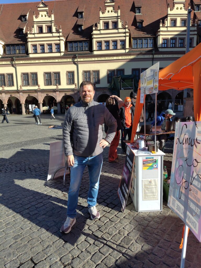 Unser Piratenstand auf dem Leipziger Marktplatz in auffälligem Orange (linkes Bild) und unser Stadtrat Paul (rechtes Bild).